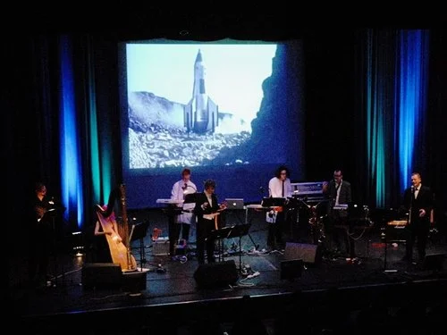 STAGE: theremins, ondes Martenot, Moog and modular synthesisers, sounds of the VCS3, concert harp, saxophones, vocal harmonies, melodica, keyboard, electric guitar, bass, percussion, and replica valve theremin (a.k.a. “Flash Gordon’s drinks cabinet”).